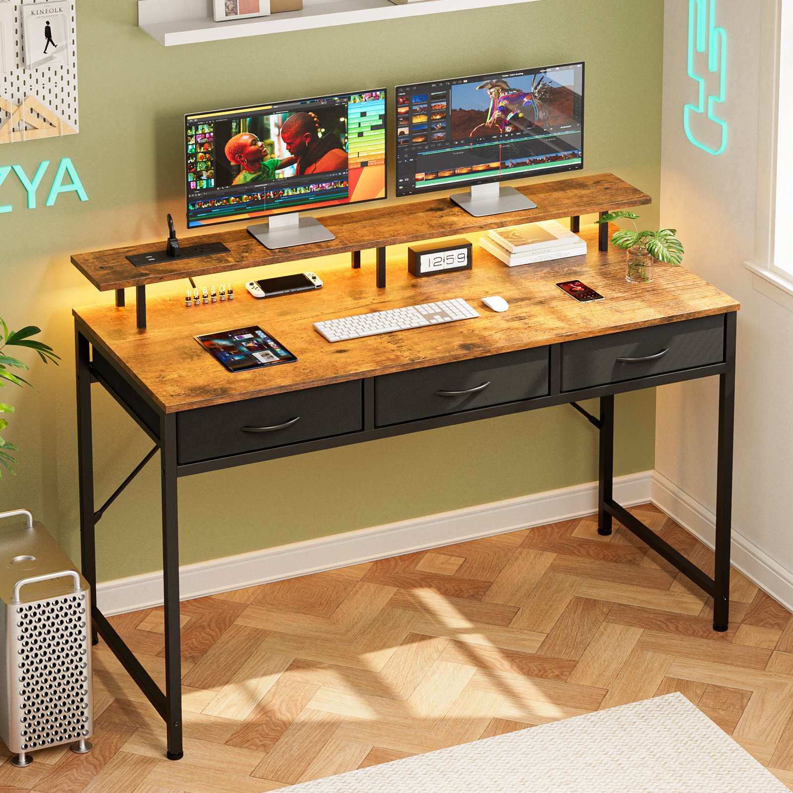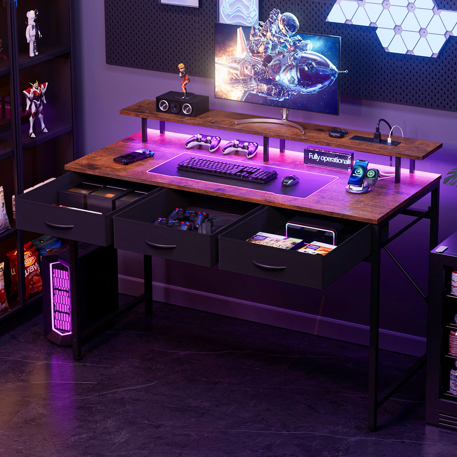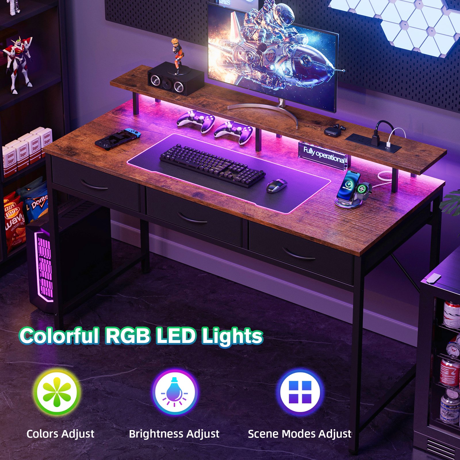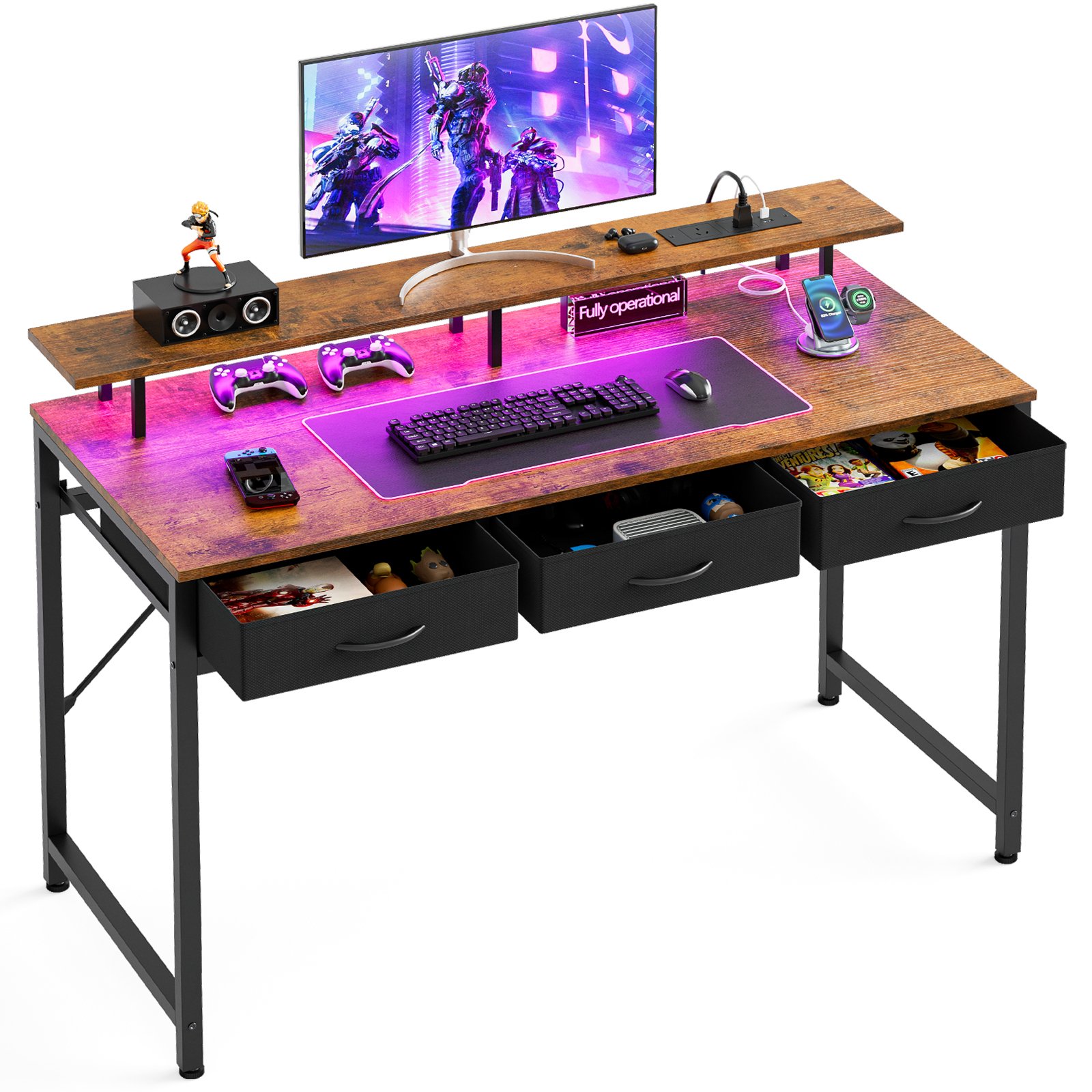 120CM Gaming Desk, Computer Desk with Charging Station and LED Light,Home Office Desk with Monitor Stand and 3 Fabric Drawers Storage, Rustic Brown