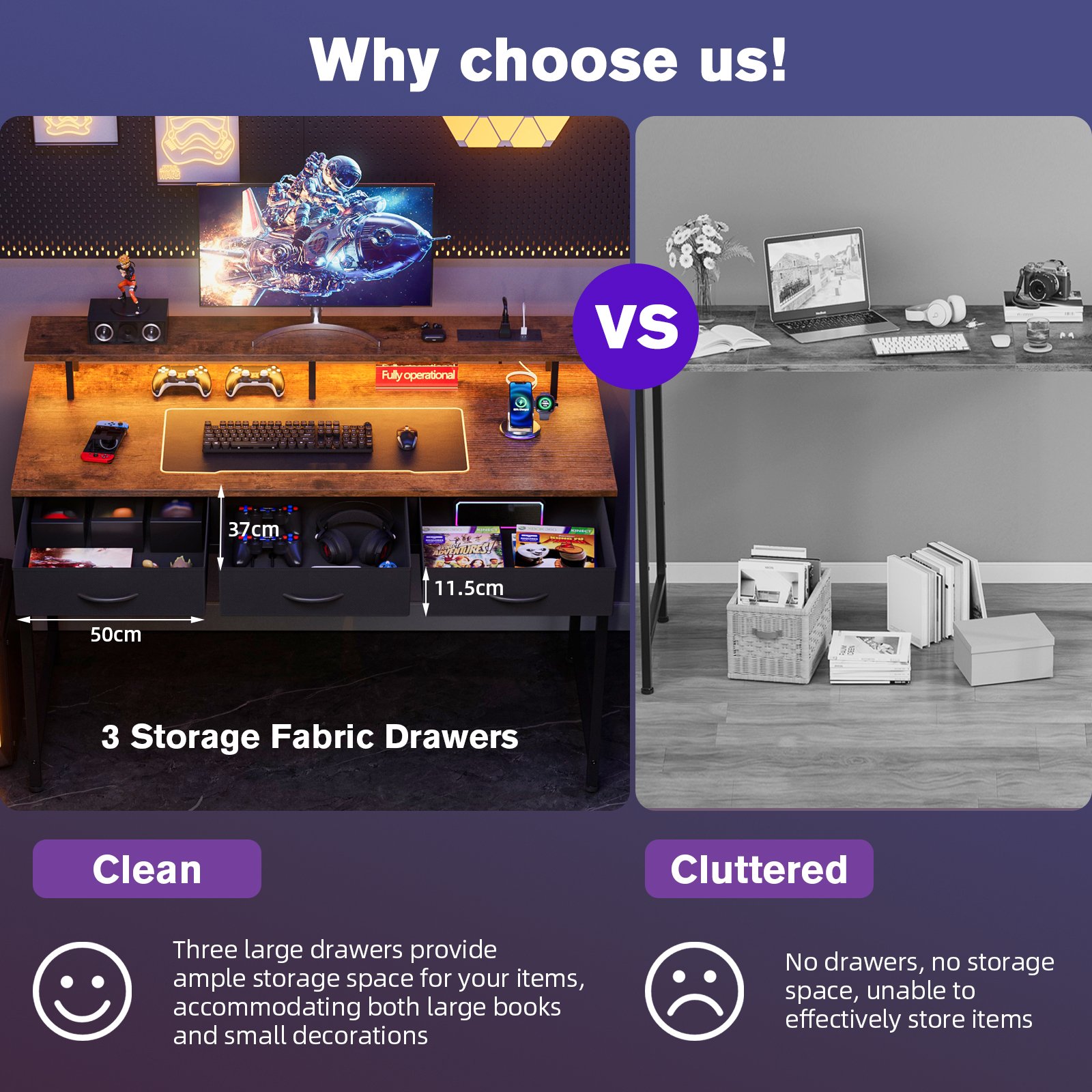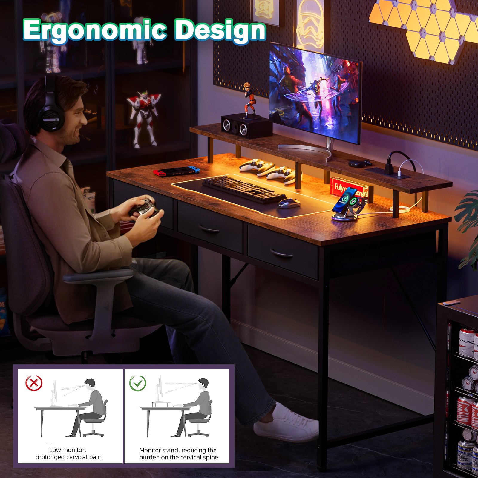 - 【Monitor Stand and Drawers Storage】Gaming Table size:120D x 50W x 75H cm.Keep your workspace organized with the wide monitor stand and 3 fabric drawers. The monitor stand provides a dedicated space for your screen, while the drawers offer ample storage for peripherals, documents, and other essentials, ensuring a clutter-free environment.