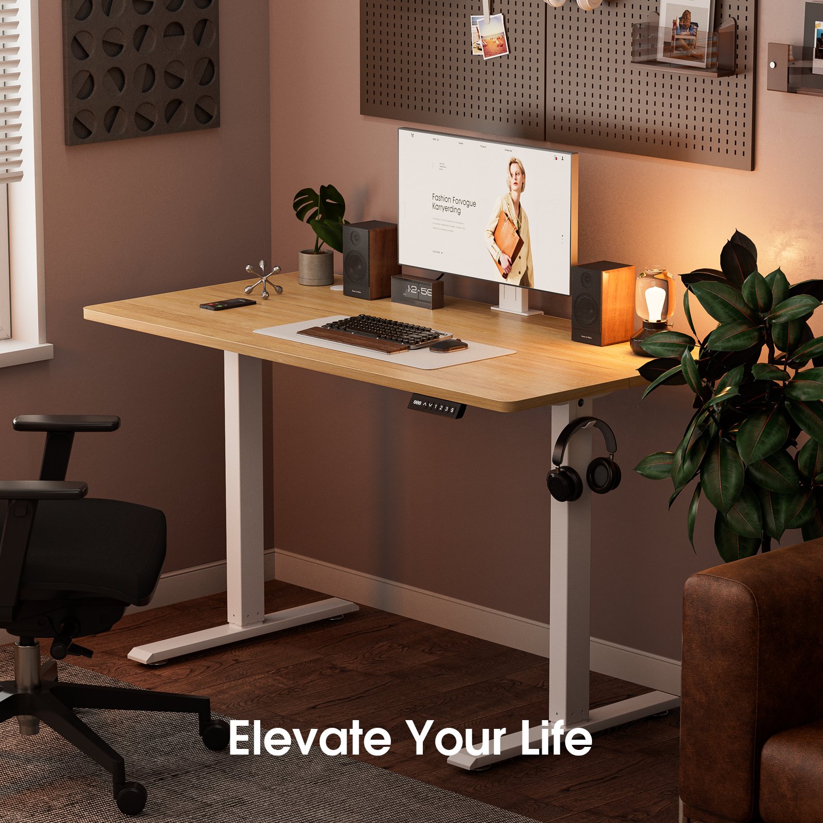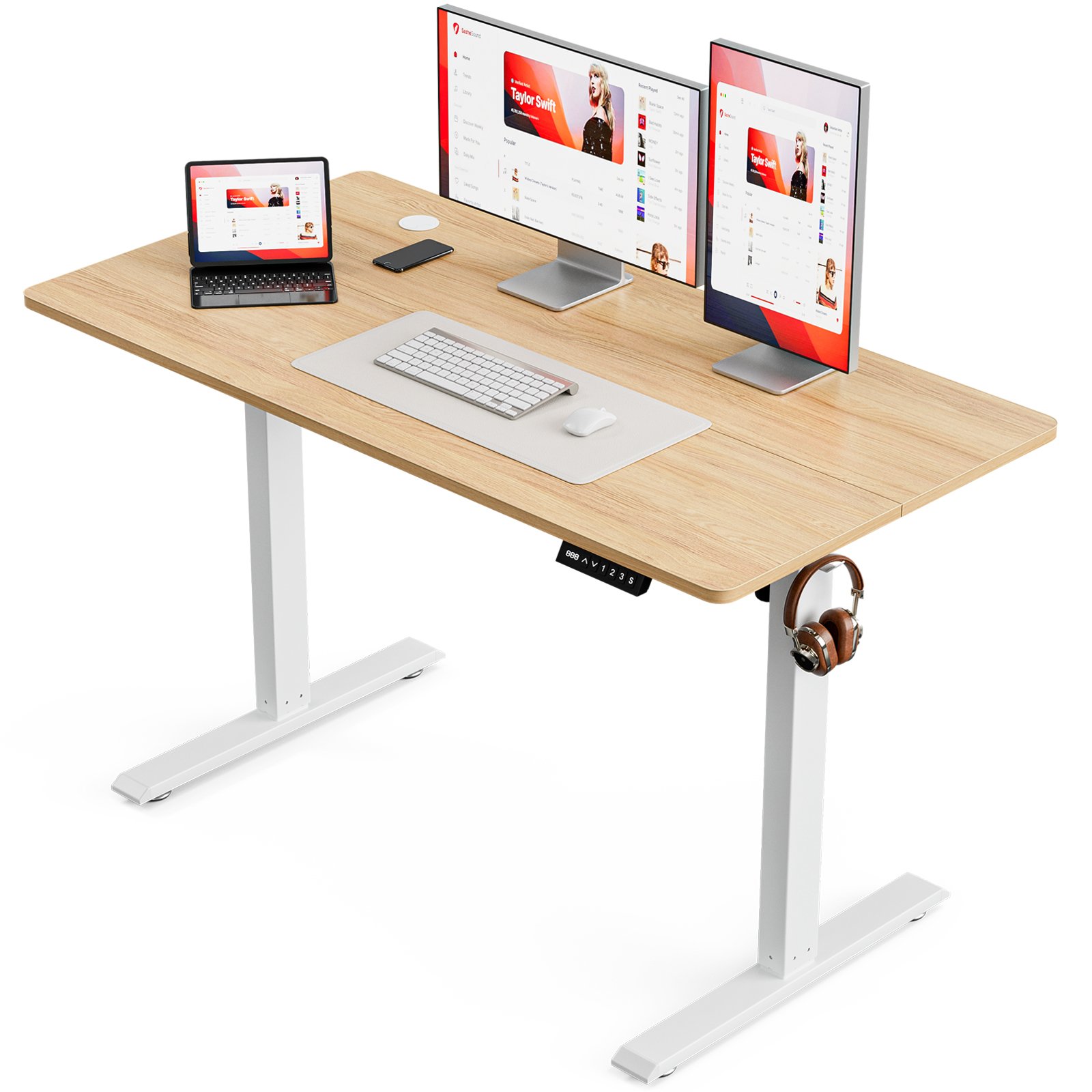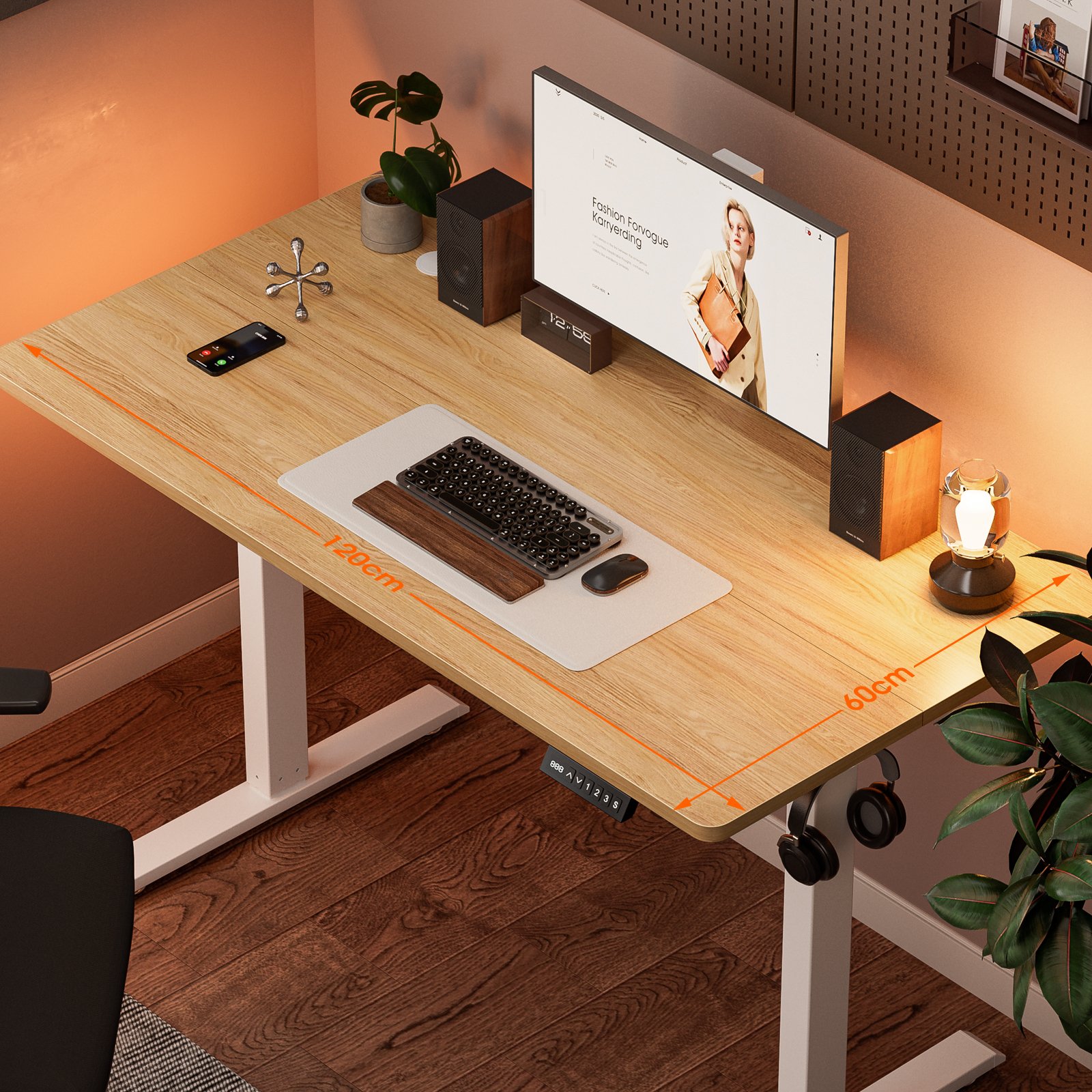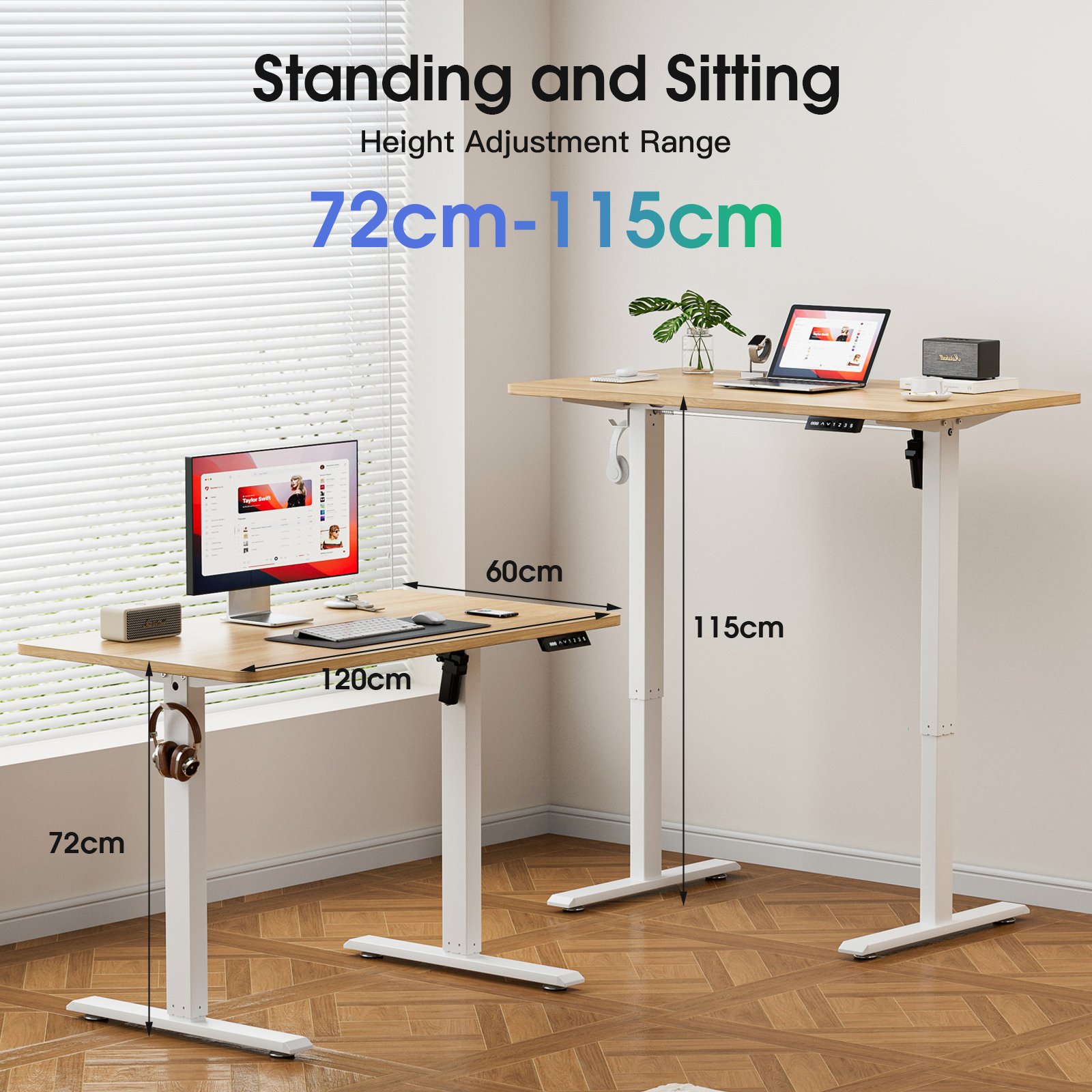 - Spacious Work Area: Upgrade your home office with our electric sit stand desk, designed with a 120X60 cm desktop to accommodate multiple monitors, laptops, and office essentials. Safty load 70kg. It features convenient hooks for hanging bags or headphones.