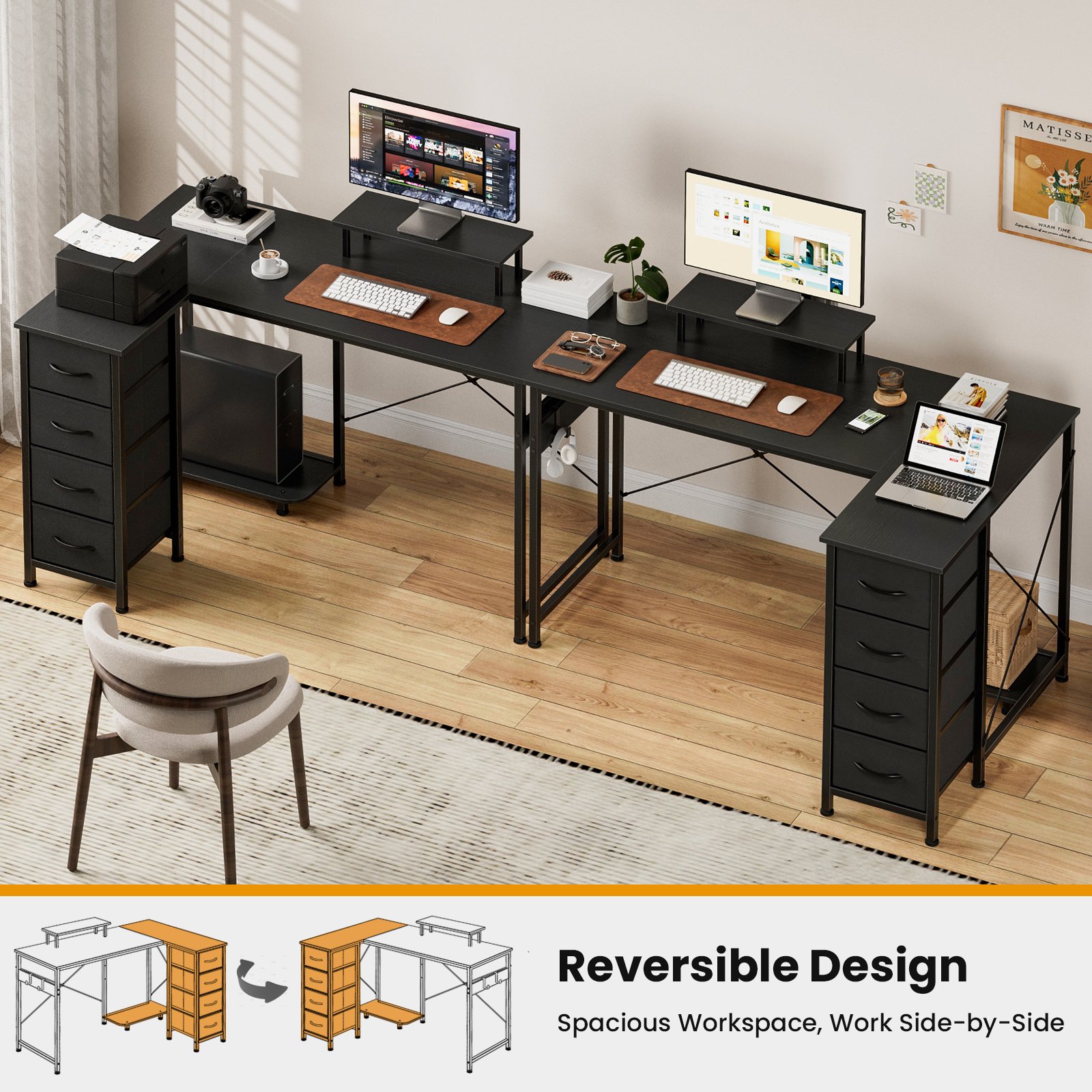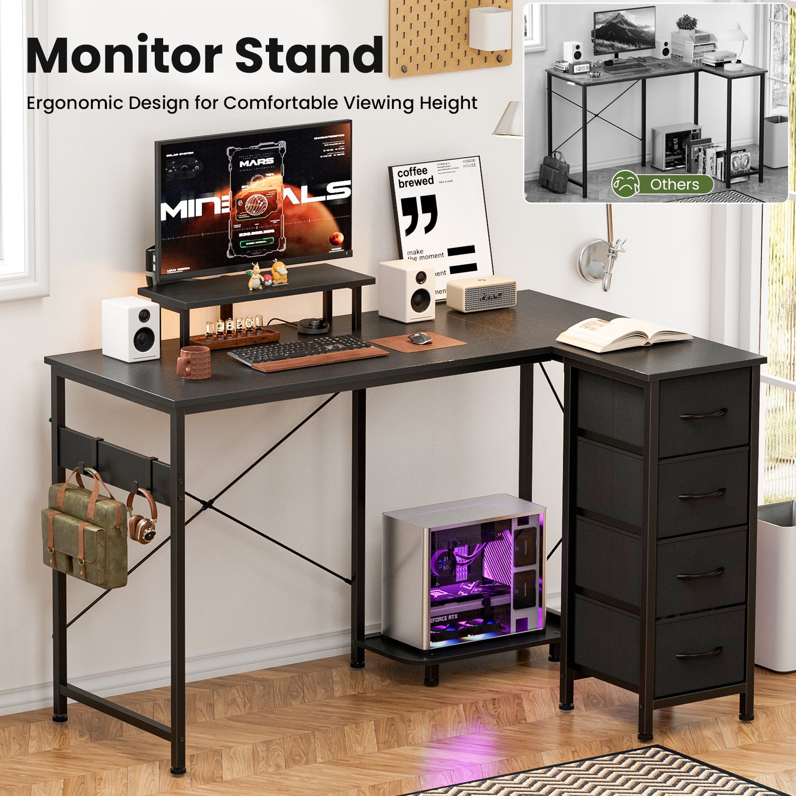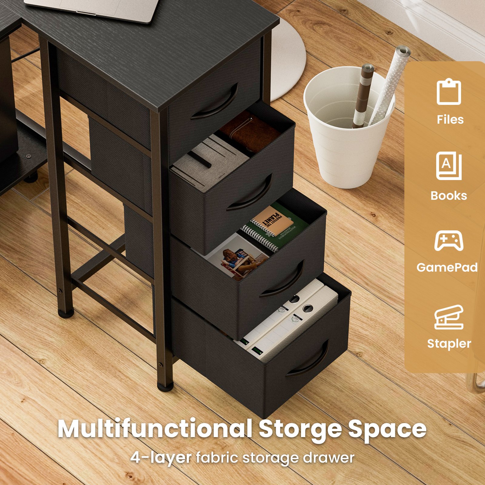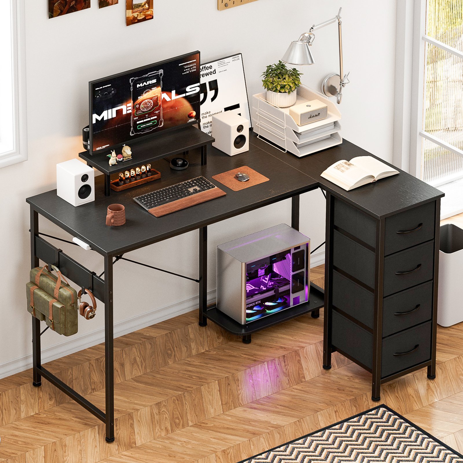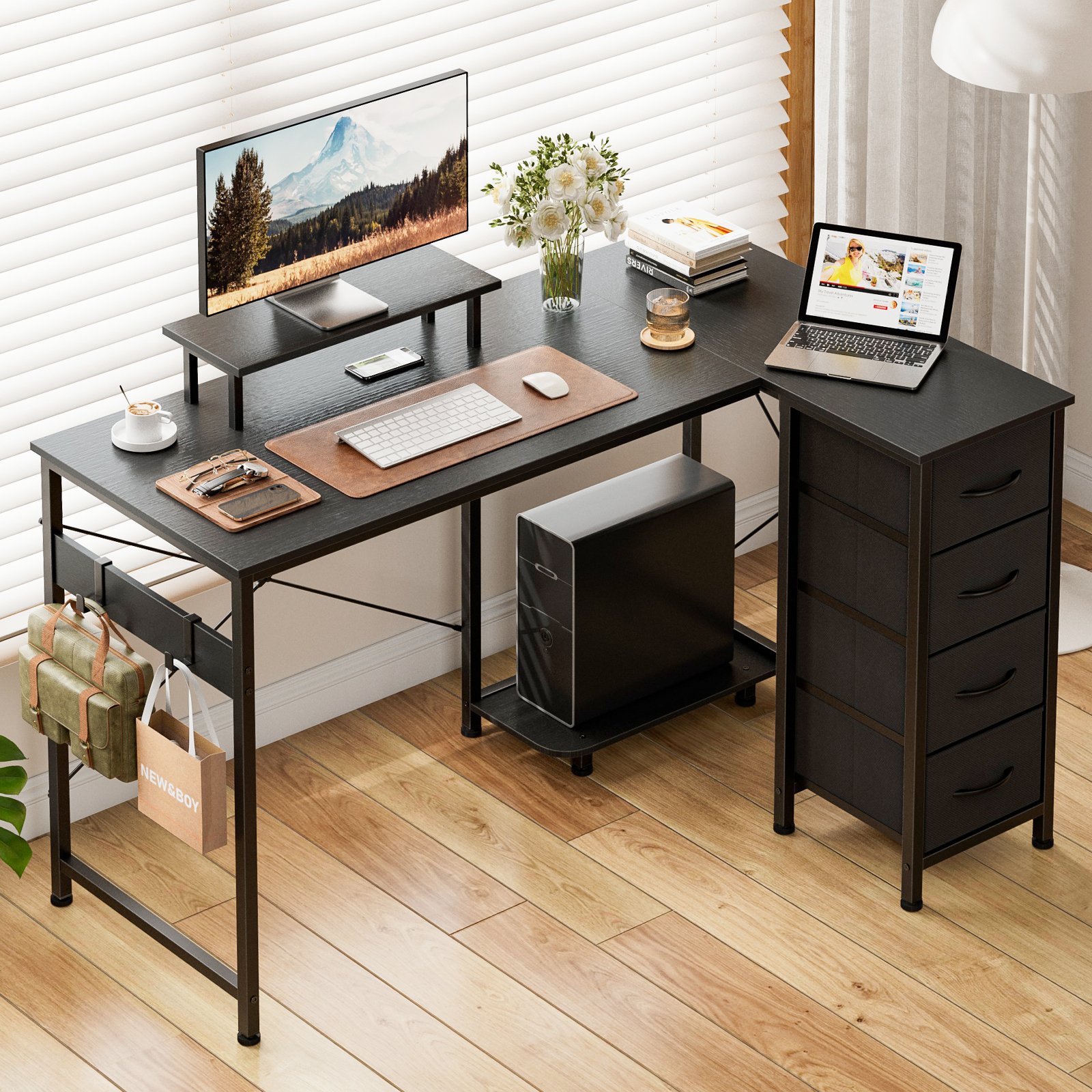 + Free Shipping- Multi-Storage Space: Enjoy multi storage options—4 fabric drawers make storaging freely just to suit your storage needs. The L-Shaped home office desk includes 2 adjustable hooks for seamless device placement, ensuring a tidy workspace. Its hiding-PC storage design allows you to personalize the layout for optimal workflow efficiency.