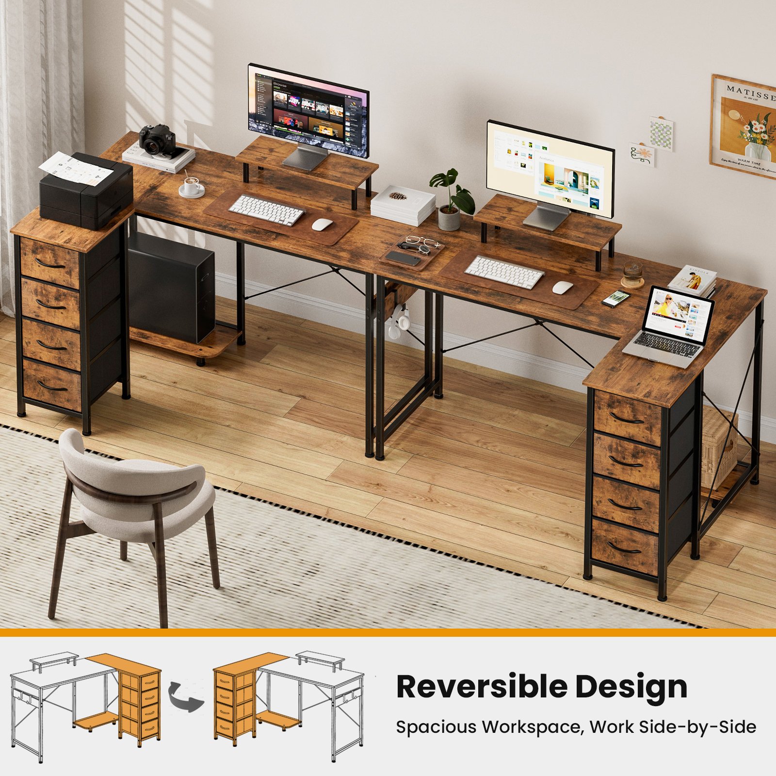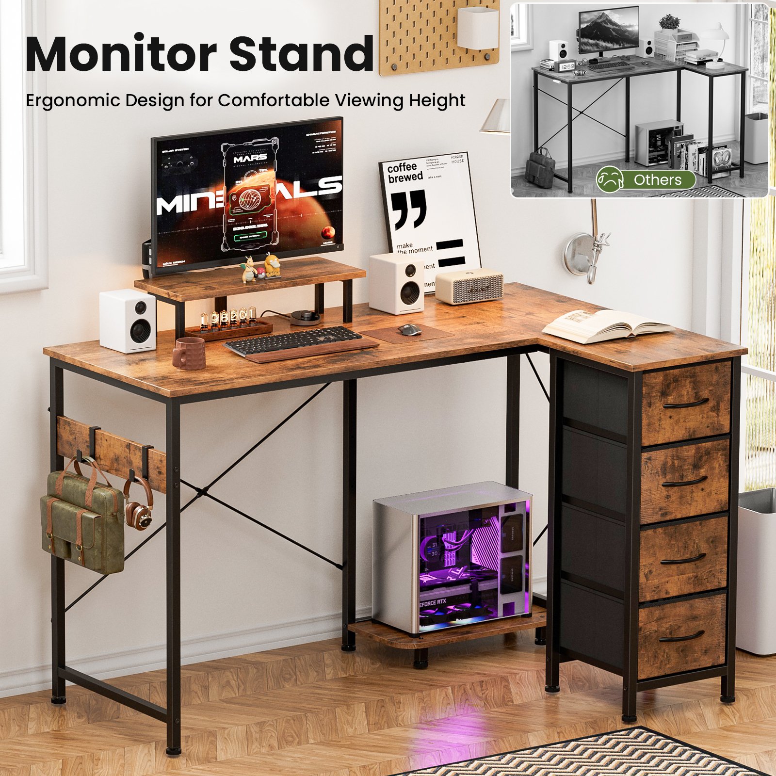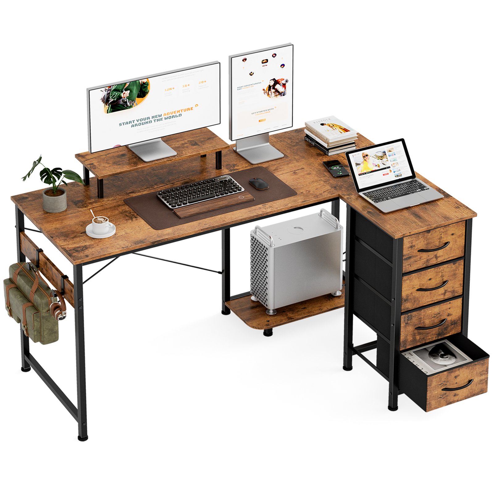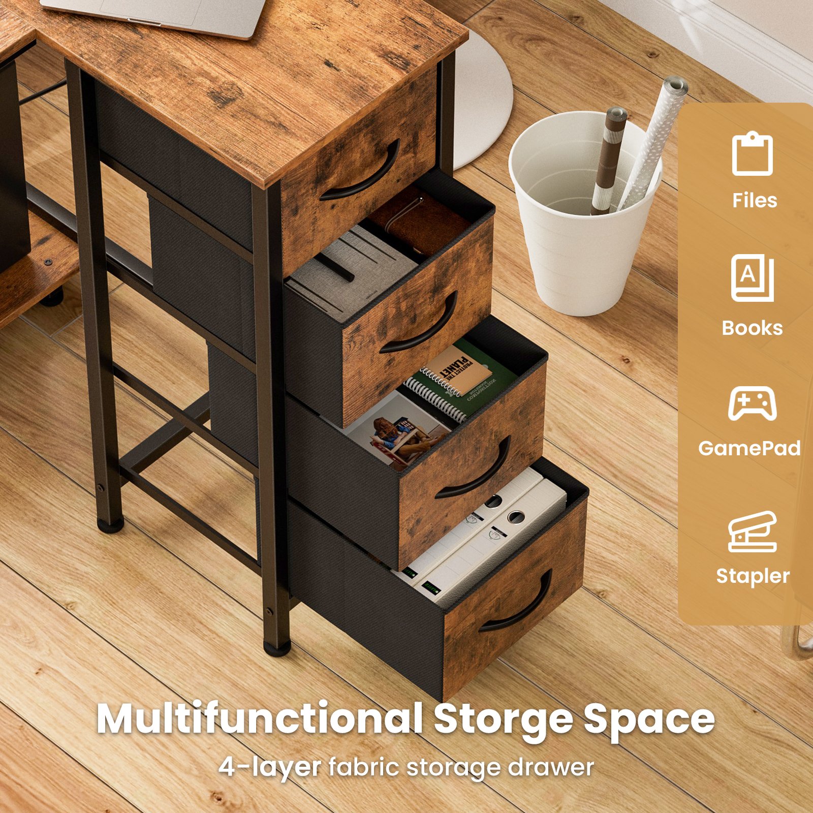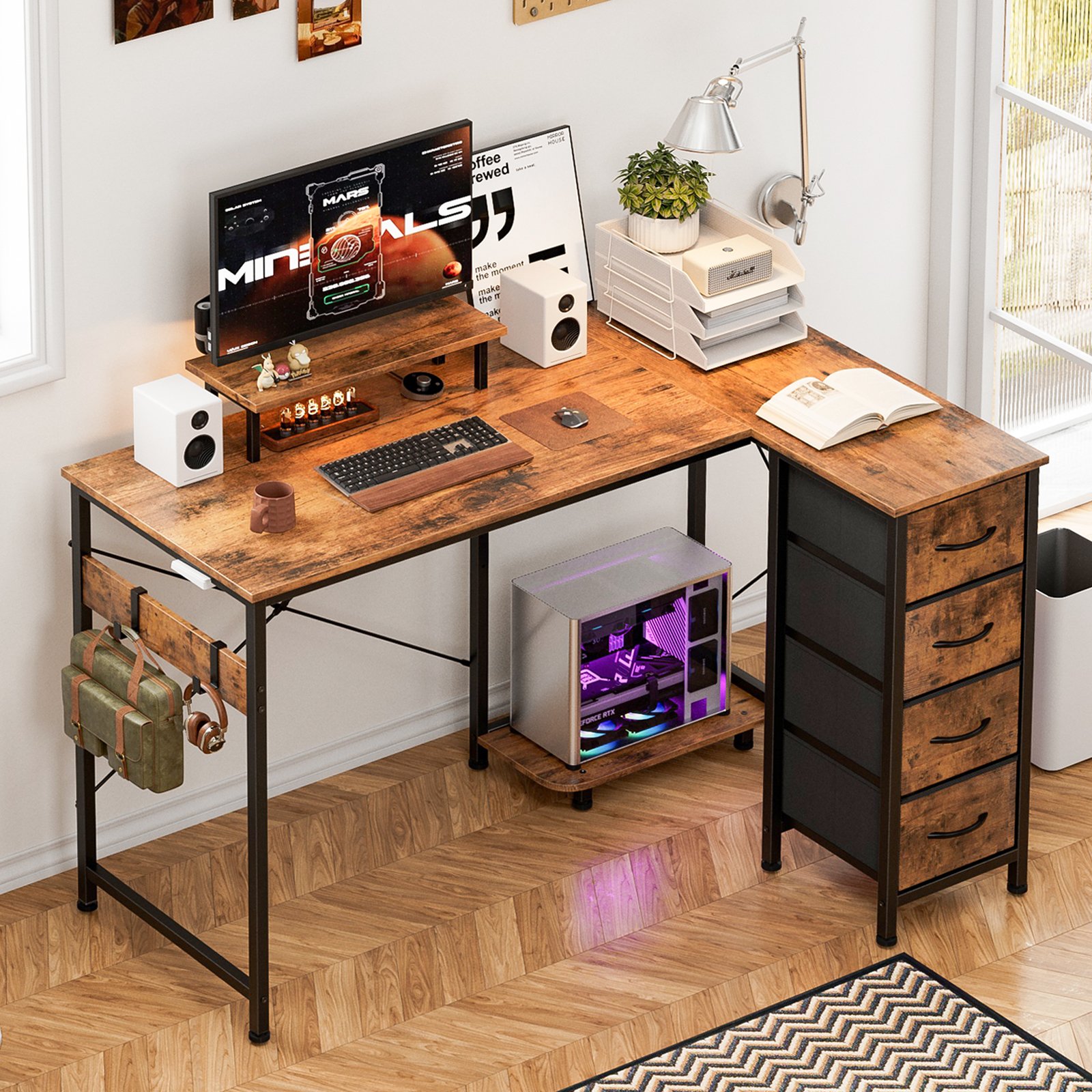 • Multi-Storage Space: Enjoy multi storage options—4 fabric drawers make storaging freely just to suit your storage needs. The L-Shaped home office desk includes 2 adjustable hooks for seamless device placement, ensuring a tidy workspace. Its hiding-PC storage design allows you to personalize the layout for optimal workflow efficiency.