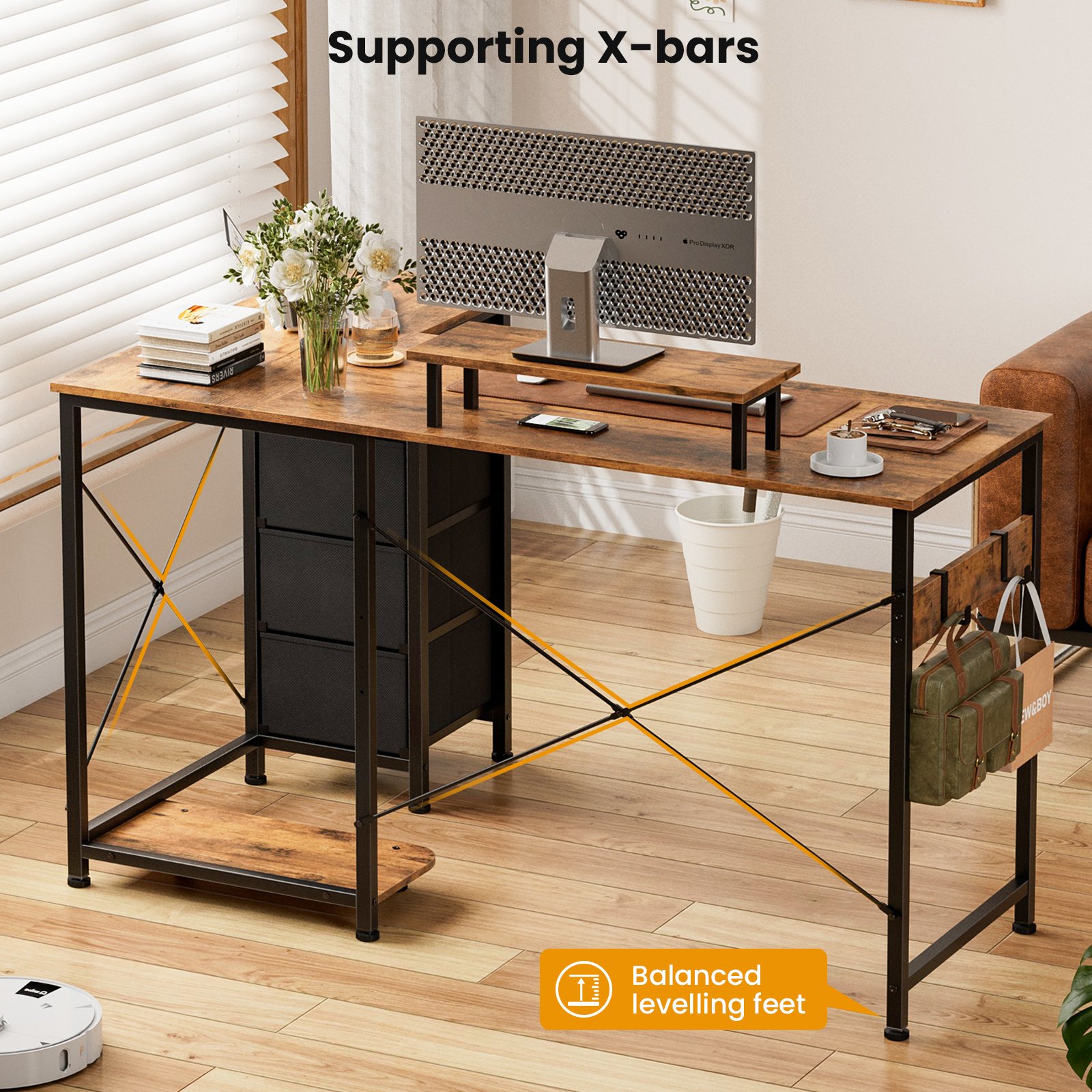 • Durable & Reinforced Build Quality:Crafted with a heavy-duty metal frame and a high-quality PB Board tabletop, this storage desk withstands daily use with ease. A reinforced stabilizing rod at the back of this study table ensures rock-solid stability, while adjustable floor feet accommodate uneven surfaces. The scratch-resistant surface and sturdy construction make it ideal for long-lasting, reliable use.